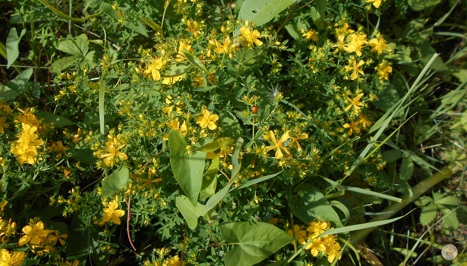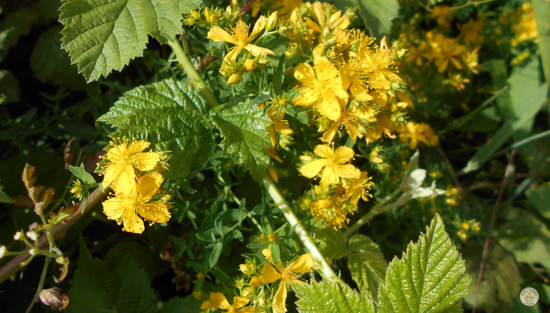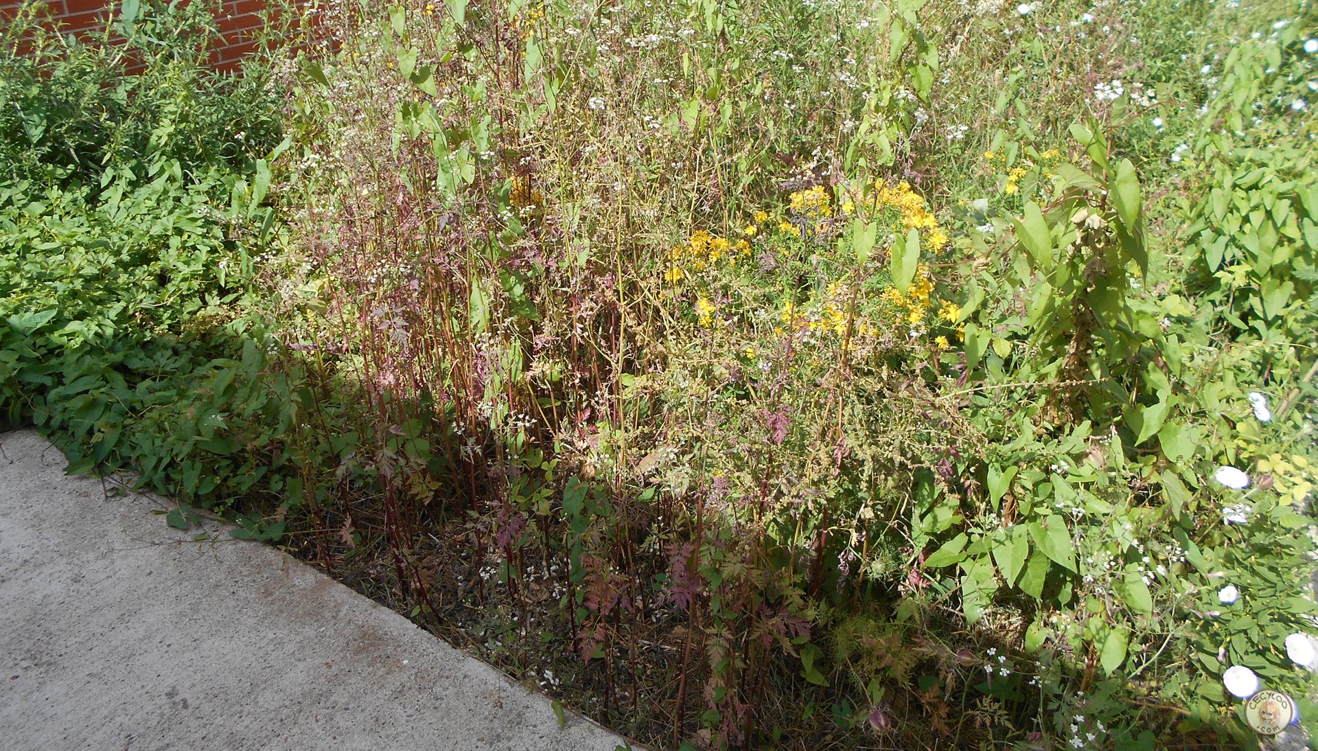 Vue d'ensemble côté portail : Boutons d'or et lierre / Cerfeuil en fin de floraison / Millepertuis + ronces + nigelles et re-lierre.