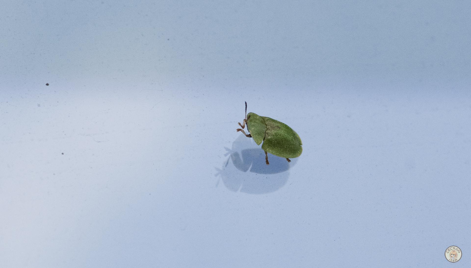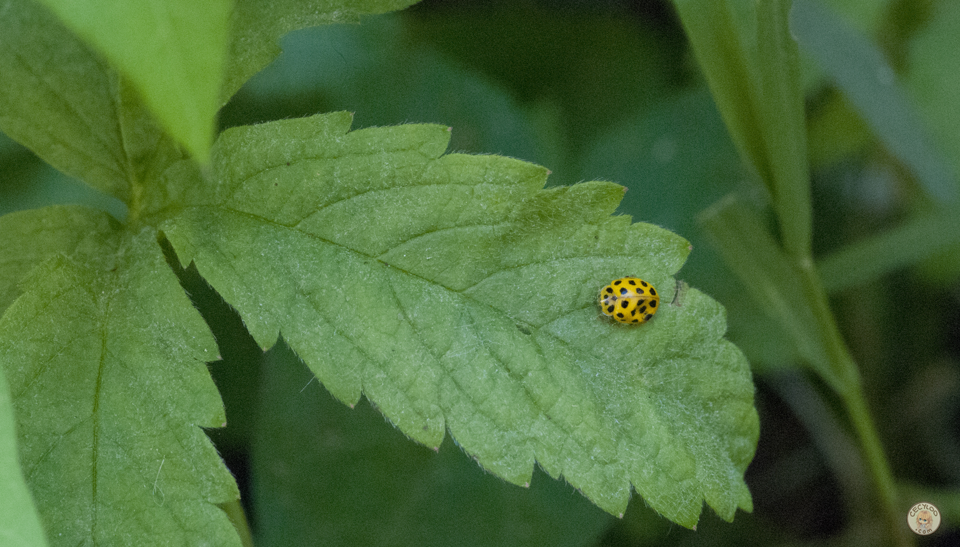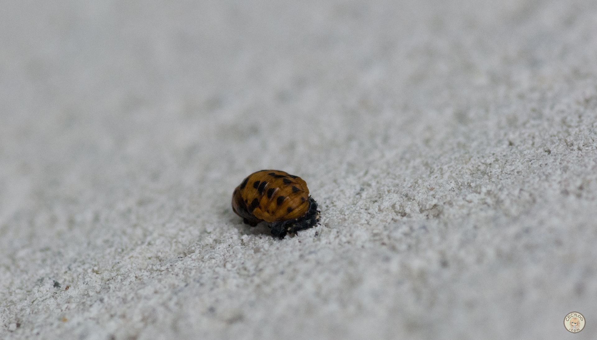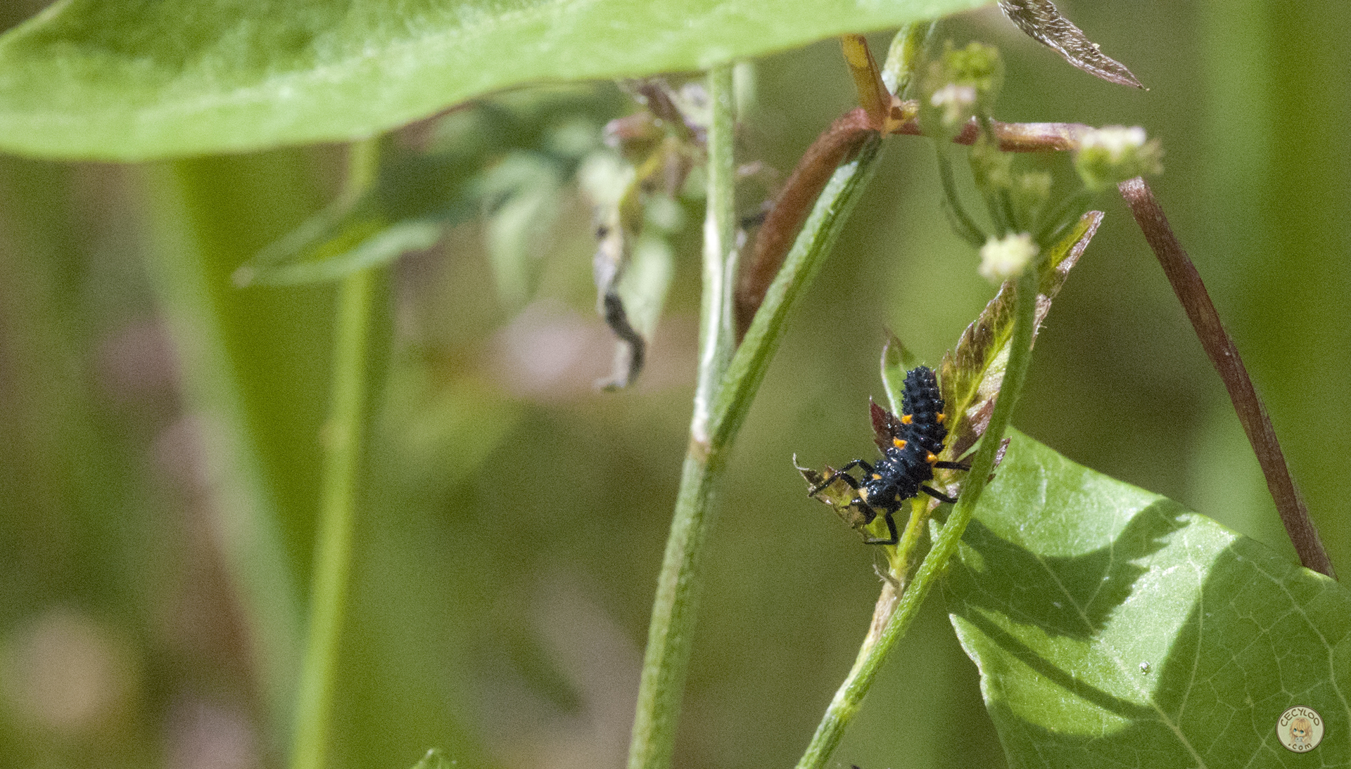 Nymphe de coccinnelle cherchant un endroit où se fixer, et buttinant au passage (ça galope !).